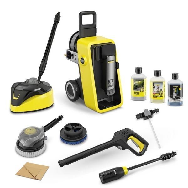 Součástí balení je sada Car & Home: čistič povrchů KÄRCHER T 7, rotační mycí kartáč KÄRCHER Power Brush WB 130 Car & Bike, autošampon KÄRCHER RM 610, čisticí prostředek KÄRCHER RM 611 (1l) na kamen a fasády a univerzální čisticí prostředek KÄRCHER RM 626 (1l).