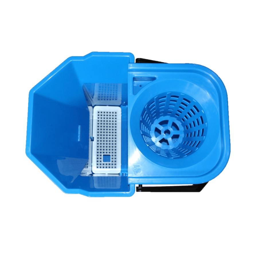 Velmi odolný kbelík pro mop s extra širokým vylévacím hrdlem a mopovým sítkem.