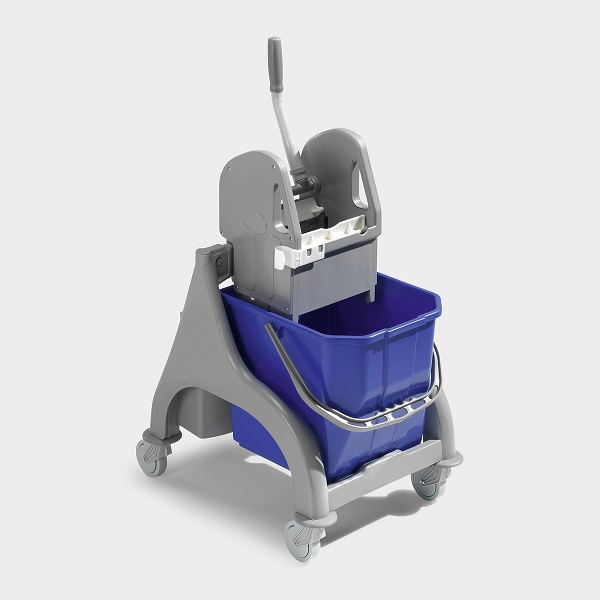 Vozík je vybaven kolečky o průměru 80 mm s integrovanými ochrannými nárazníky, což zaručuje vynikající mobilitu při úklidu.
